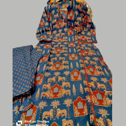 This is a stylish Angrakha-style kurti set made from pure cotton for soft and breathable comfort. The kurti features a beautiful printed design with Kiroshiya lace work, paired with matching printed pants. Perfect for daily wear, office, or casual outings.